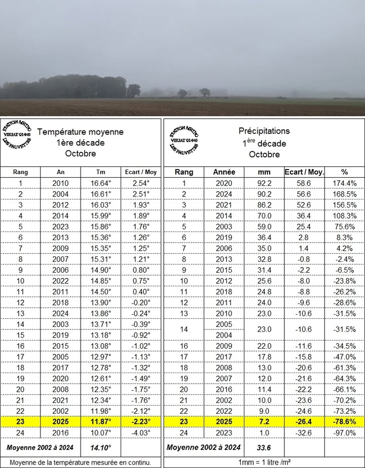 on 11 octobre 2025 at 8:21 AM Alors que la seconde débute dans le brouillard, retour en chiffres sur la première décade d’octobre, où le brouillard a souvent été présent, dont la température moyenne a été particulièrement fraîche et les précipitations très faibles. Pour une analyse plus détaillée : Températures décadaires👉 https://www.meteo-viriat.fr/articles.php?lng=fr&pg=98&mnuid=779&tconfig=0#z2 Précipitations décadaires👉 https://www.meteo-viriat.fr/articles.php?lng=fr&pg=87&mnuid=779&tconfig=0#z2 Les conditions anticycloniques perdurant ce weekend il faudra composer avec le brouillard et de faibles éclaircies l’après-midi en plaine de Bresse☁️🌥