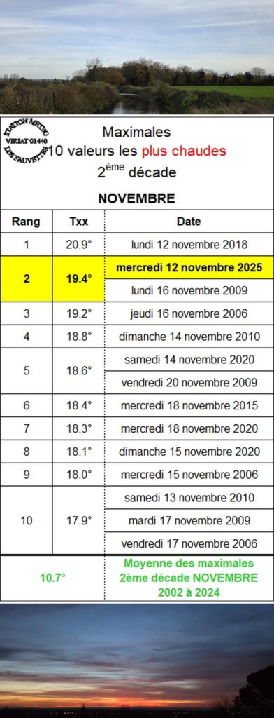 on 12 novembre 2025 at 7:37 PM Vous voulez tout savoir sur Claudia, la dépression qui nous envoie cet air chaud🤔 alors 👉 https://meteofrance.com/actualites-et-dossiers/actualites/douceur-remarquable-sur-le-pays 19.4° pour ici sous abri normalisé et 63km/h pour la plus forte rafale de vent. Pour tout savoir sur les fortes rafales à Viriat 👉 https://www.meteo-viriat.fr/articles.php?lng=fr&pg=1621&mnuid=779&tconfig=0#z2 Les 6 autres stations Davis pro ont également enregistré des températures très élevées et de fortes rafales : Météo Bourg en Bresse – Ain 01 : 19.4° | 58km/h St Etienne du bois : 19.5° | 53km/h St Just : 19.6° | 58km/h Météo Buellas – Ain 01 : 18.9° | 69km/h Jasseron : 19.8° | 52km/h Etrez : 18.7° | 47km/h Pour suite de la très grande douceur portée par un turbulent vent du Sud demain!