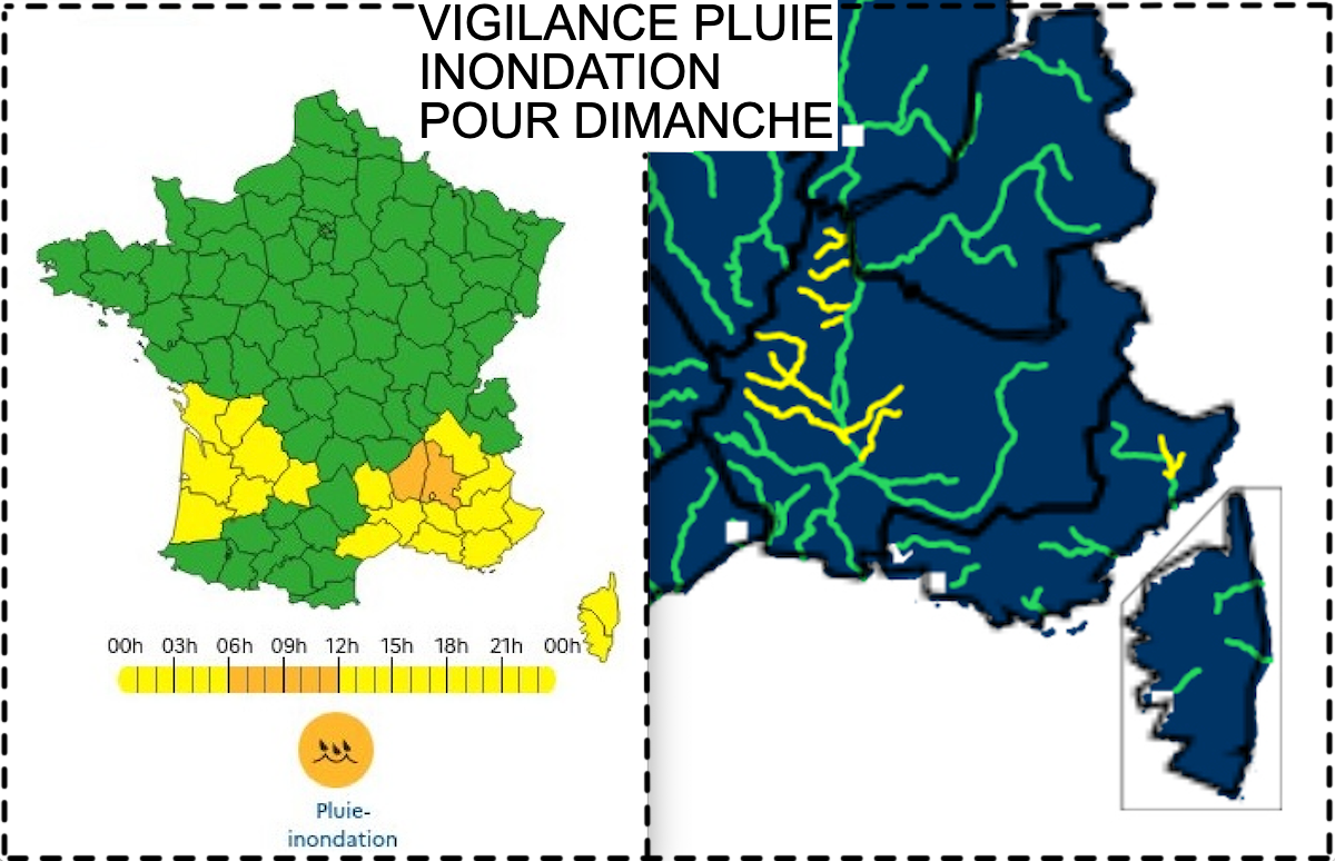 Compte tenu de la saturation des sols suite aux récentes précipitations abondantes, il est possible que certains cours d’eau présentent une réaction plus prononcée que samedi, notamment dans l’arrière-pays niçois et sur les Cévennes. Par conséquent, plusieurs départements sont placés en vigilance jaune ou orange.