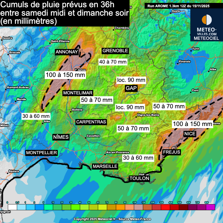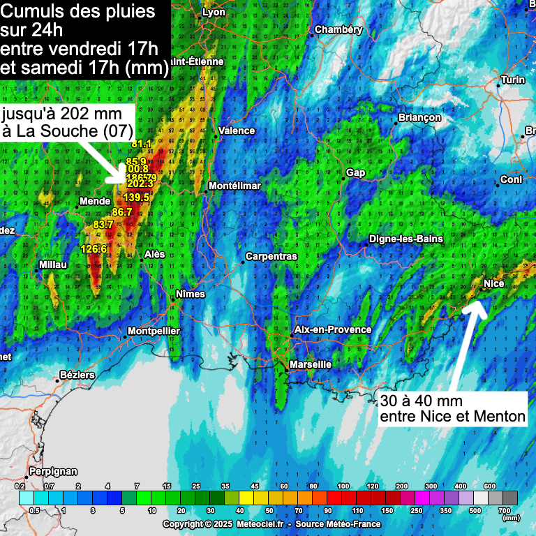 Les cumuls de précipitations prévus devraient être comparables à ceux enregistrés ces dernières heures sur les Cévennes ardéchoises, mais probablement supérieurs à ceux de samedi dans la Drôme et significativement plus importants dans l’arrière-pays azuréen, sur les hauteurs entre Fréjus, Nice et Menton. Sur cette zone géographique, il est envisageable de dépasser largement les 100 mm en 24 heures.