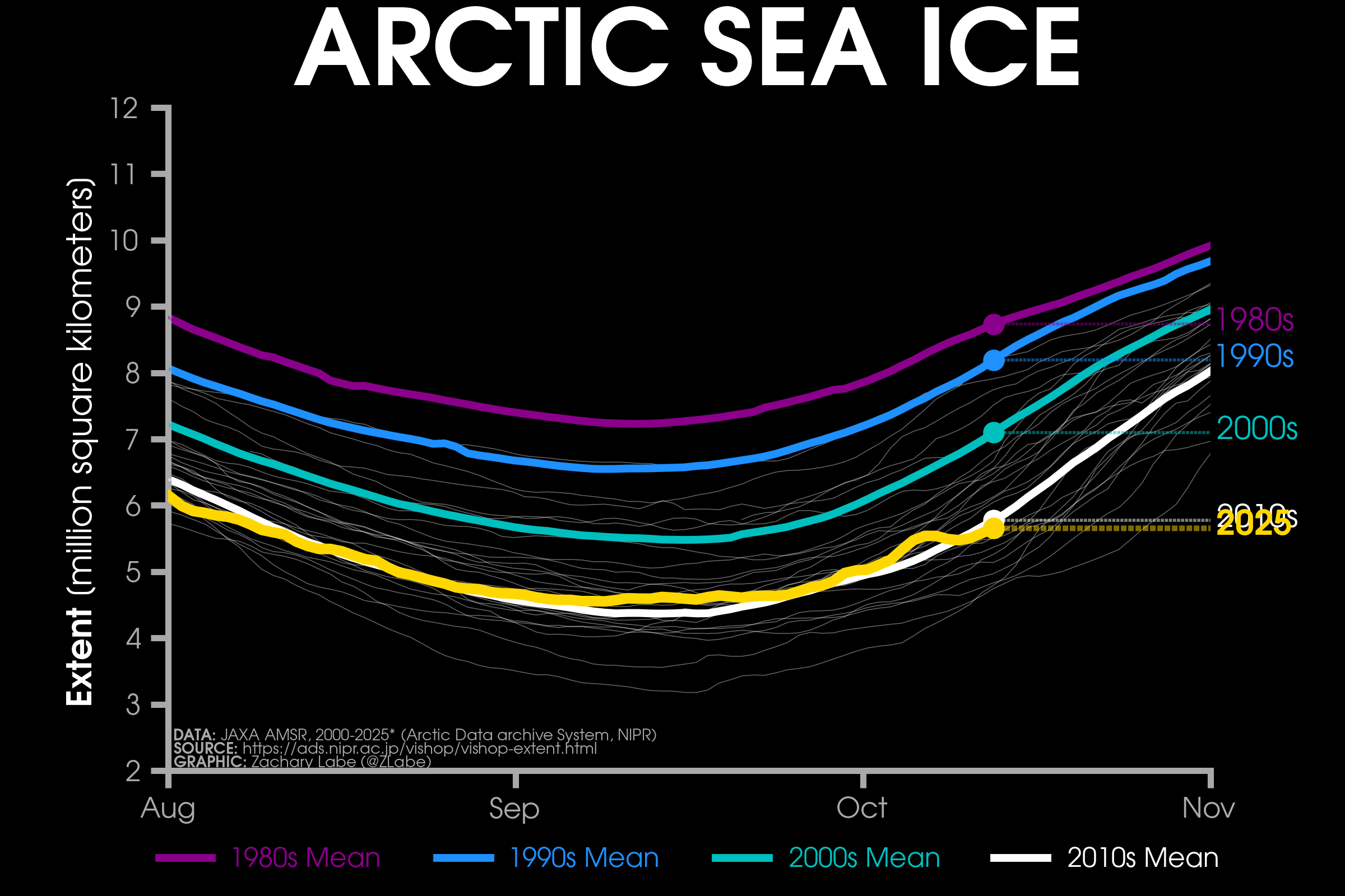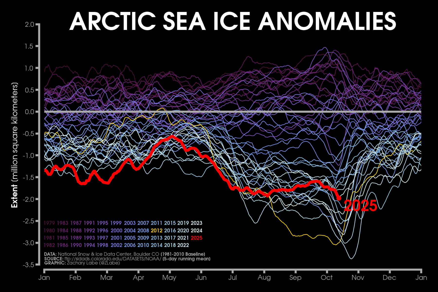 Anomalie de superficie de la banquise par année depuis 1979 (2025 en rouge) – via zacklabe.com