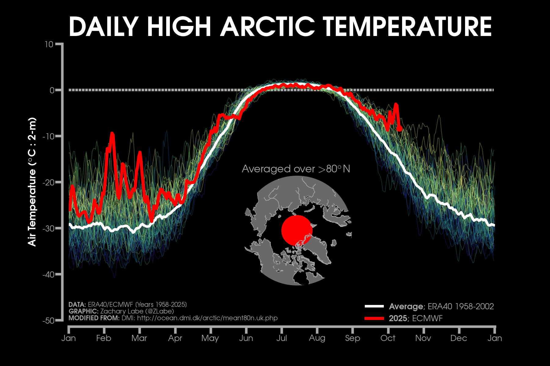 Température moyenne en Arctique (2025 en rouge) par rapport à la moyenne (en blanc) – via zacklabe.com