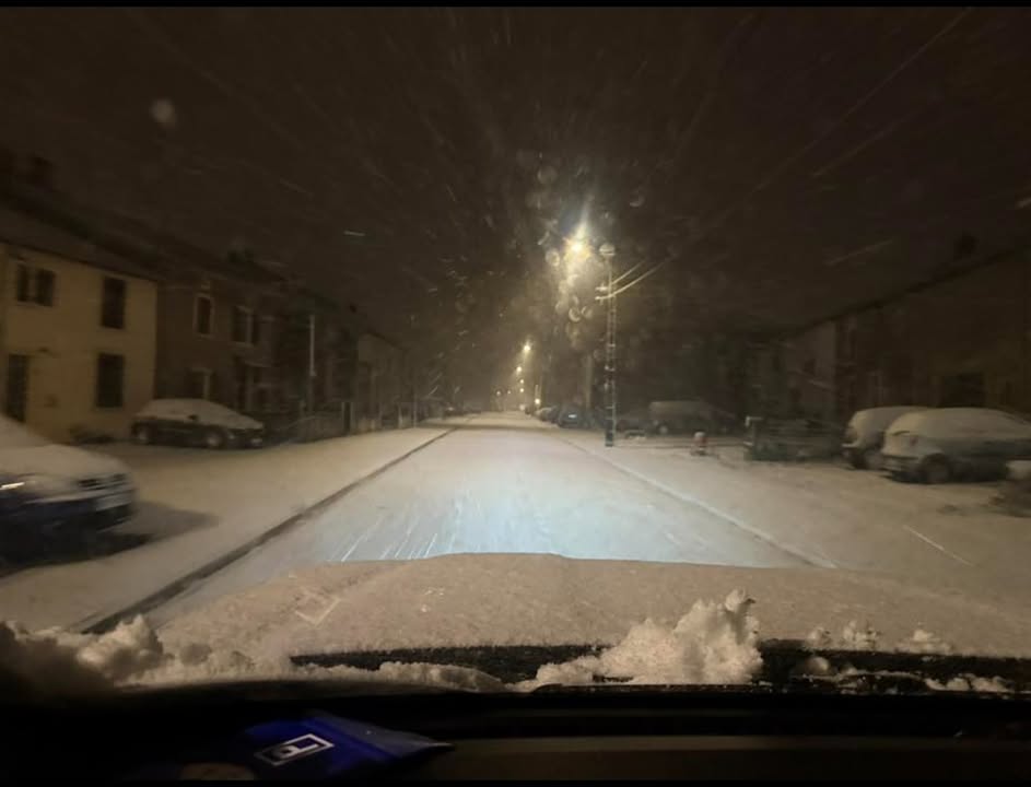 Comme prévu, la neige fait parfois son retour dans le nord-est, comme ici à Villers-la-Montagne (Meurthe-et-Moselle). Des difficultés de circulation sont signalées sur l’A30 en direction du Luxembourg. Photo InfoTrafic Lorraine & Frontières