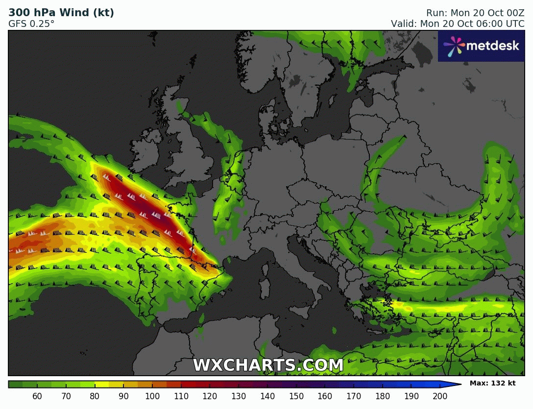 Évolution du courant jet sur l’Europe du 20 au 26 octobre 2025 – Modèle GFS via WX CHARTS