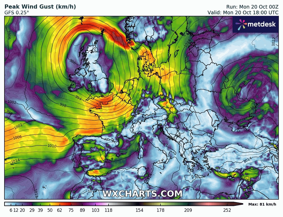Animation des rafales de vent et des isobares sur l’Europe du 20 au 25 octobre 2025 – Modèle GFS via WX CHARTS