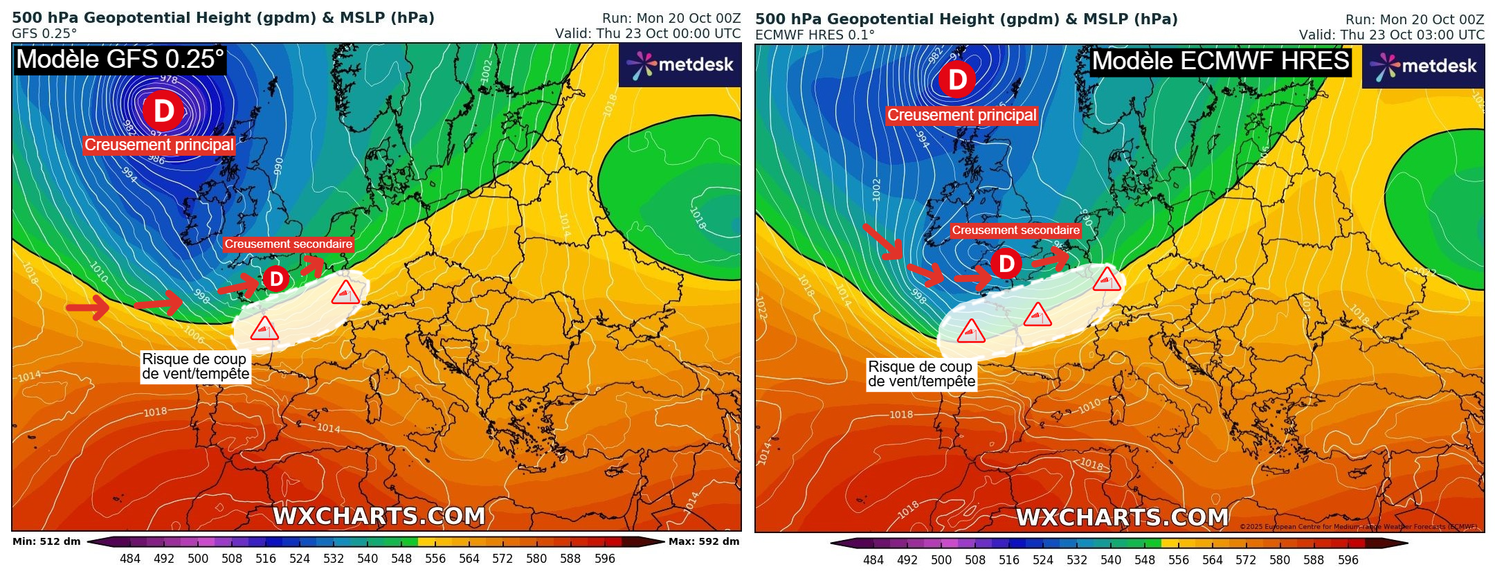 Évolution du risque de tempête sur la France entre mercredi 22 et jeudi 23 octobre 2025 – Modèle GFS via WX CHARTS