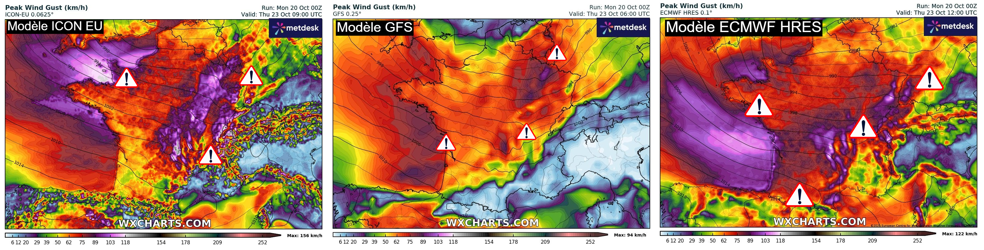 Il est donc pour le moment difficile d’établir une prévision véritablement fiable quant à l’intensité exacte de ce coup de vent/tempête en milieu de semaine sur la France, tout comme les zones les plus touchées. Pour le moment, il semble néanmoins que les régions situées entre l’Atlantique, les côtes de la Manche ainsi qu’au nord de la Loire semblent les plus exposées au risque de vents puissants entre mercredi 22 et jeudi 23 octobre.