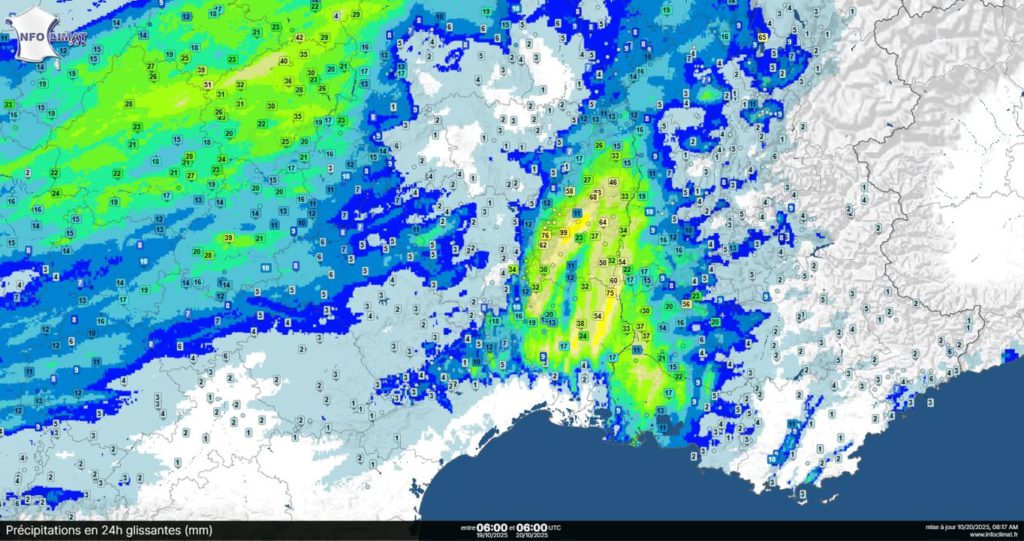 Après une période calme et anticyclonique, un flux perturbé venu de l’Atlantique apporte depuis hier soir de belles précipitations, notamment sur les Cévennes et l’ouest du Massif central.
