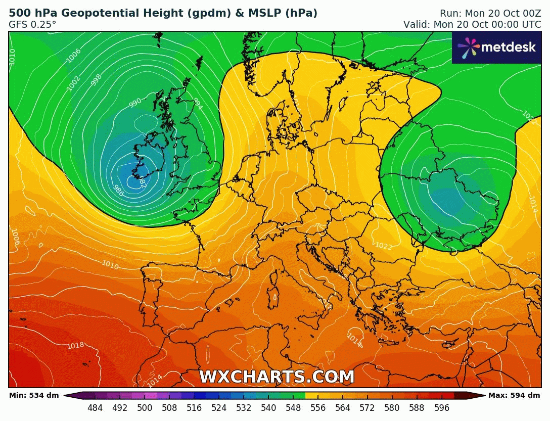 Animation des géopotentiels sur l’Europe du 20 au 26 octobre 2025 – Modèle GFS via WX CHARTS