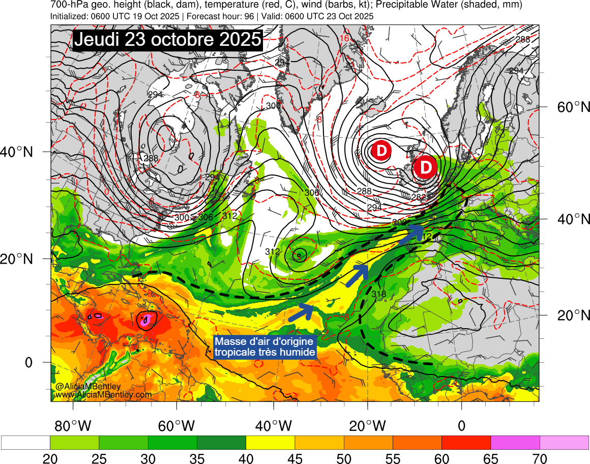 Masse d’air très humide venant des tropiques cette semaine sur l’Europe et la France – Via Atmos.albany.edu