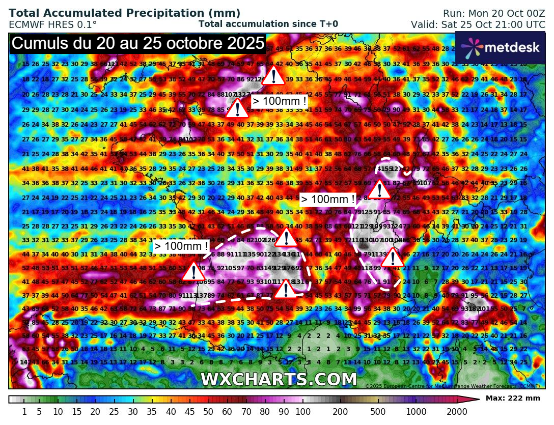 Cumuls de précipitations sur la France jusqu’au samedi 25 octobre 2025 – Modèle ECMWF-HRES via WX CHARTS