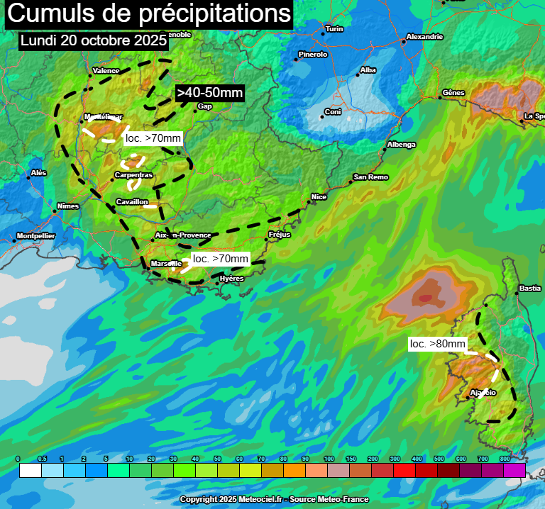 Ce lundi déjà, les précipitations se montrent parfois fortes sur le sud-est du pays avec des pluies parfois fortes et orageuses persistant jusqu’en fin de journée, pouvant donner des cumuls notables entre les abords de la vallée du Rhône, la Côte d’Azur et l’ouest de la Corse.