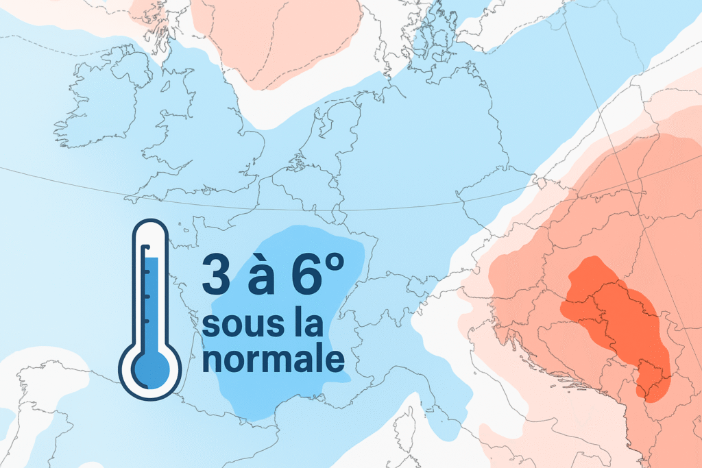 Tout au long de la semaine, l’indicateur thermique nationale sera largement inférieur aux normales avec un minimum d’environ 5°C en-dessous de la moyenne entre mercredi et jeudi.