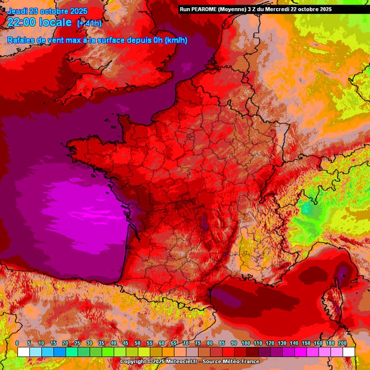 Le modèle AROME indique un potentiel de rafales convectives maximum pouvant atteindre les 160 km/h sur les côtes et 120 km/h dans les terres sous les cellules orageuses les plus virulentes et très localement. ⚠️ #VigilanceOrange