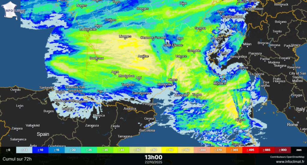 đ§ Les cumuls depuis dimanche sont importants, avec une Ă©tendue assez vaste de stations dĂ©passant les 100 mm. La pluie va se poursuivre, avec une tempĂȘte prĂ©vue demain (6 dĂ©partements de la moitiĂ© Ouest ont Ă©tĂ© placĂ©s en vigilance orange vent par MĂ©tĂ©o-France).