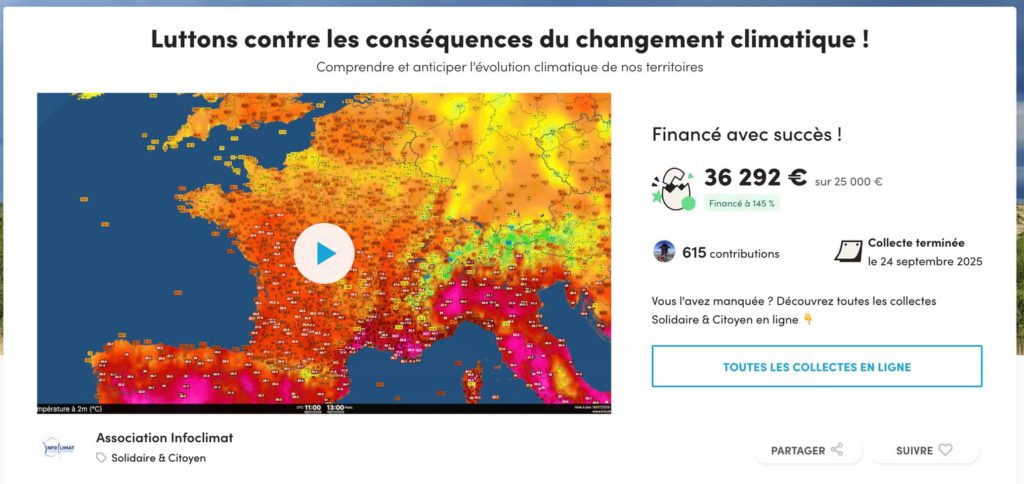 Merci pour vos contributions et vos soutiens qui nous ont permis de réussir cette première collecte de crowdfunding pour l’association Infoclimat !