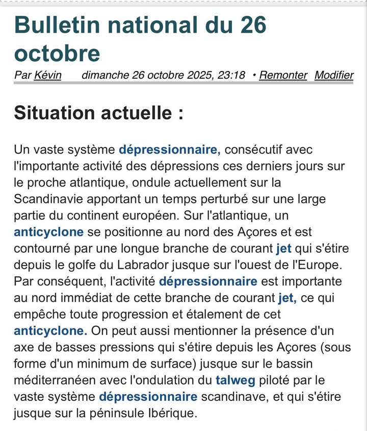 on 27 octobre 2025 at 7:09 AM Bulletin météo national – 26/10 Flux très dynamique sur l’Europe : vaste dépression ondulant jusqu’à la Scandinavie, anticyclone des Açores bloqué par un puissant courant-jet, et un axe de basses pressions jusqu’à la Méditerranée. ➡️ France toujours sous influence perturbée : vent, averses, fraîcheur automnale 🍂💨 🔎 Suivi en temps réel sur Infoclimat Merci Kevin Fillin pour ce bulletin !Photos de la publication de Infoclimat