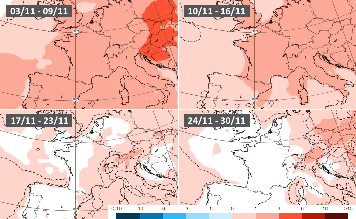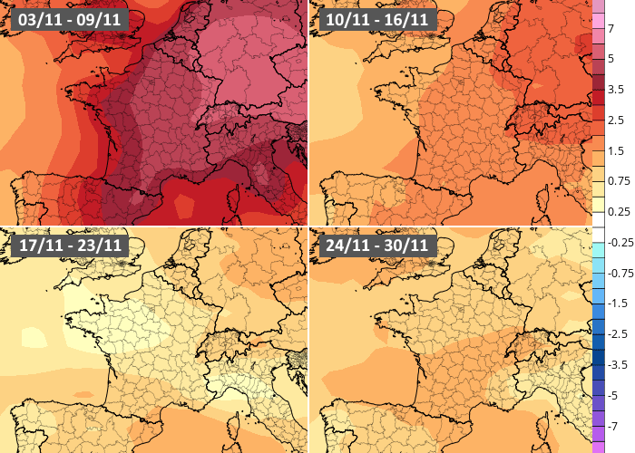 Anomalies thermiques hebdomadaires en novembre 2025 – modèle européen via ECMWF