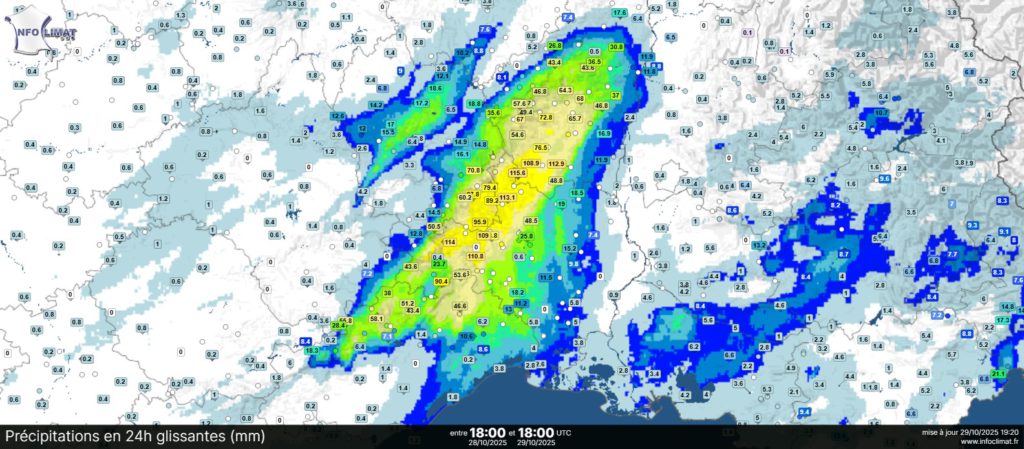 đ§ Comme prĂ©vu, une ligne-pluvio orageuse s’est formĂ©e sur les CĂ©vennes et ses abords. Les cumuls dĂ©passent par endroit les 100 mm avec :