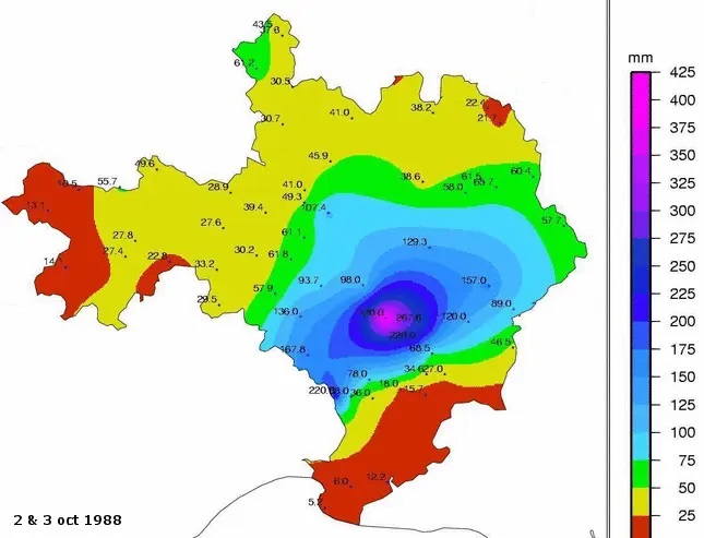Cumuls de précipitations lors de l’épisode orageux du 2/3 octobre 1988 dans le Gard – Archives Météo-France
