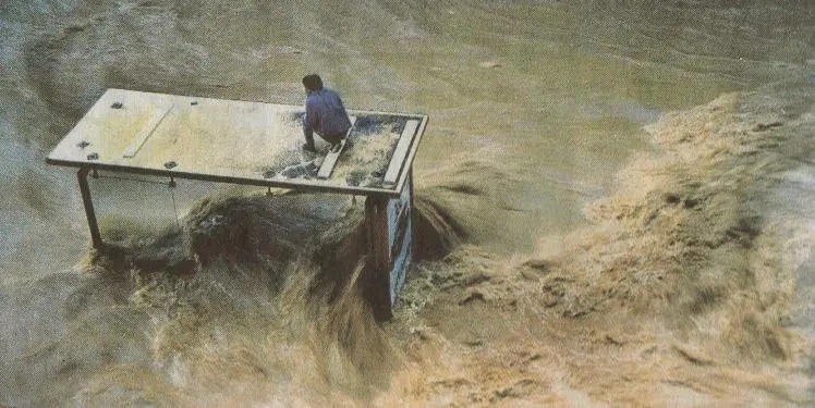 Un habitant se réfugie sur un abri bus pour éviter les torrents de boue en plein Nîmes en matinée du 3 octobre 1988 – Archives Météo-Villes