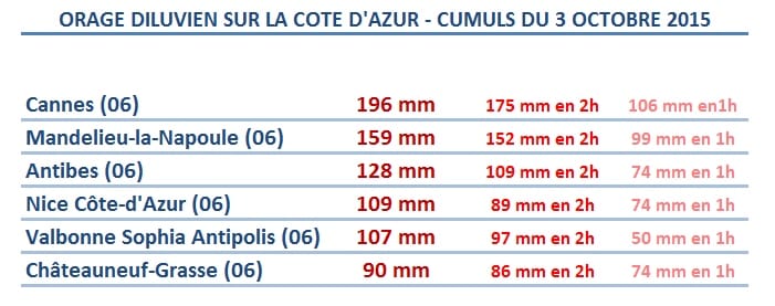 Les intensités pluvieuses se sont en effet avérées extrêmes sur ces secteurs avec par exemple 106mm en 1h à la station de Cannes, 99mm durant le même laps de temps à la station de Mandelieu à quelques kilomètres de là. On a pu relever 175mm en seulement deux heures à Cannes (196mm au total) et 152mm à Mandelieu (159mm au total) mais également 109mm durant ce même laps de temps à Antibes et 89mm à Nice. Notons aussi des cumuls impressionnants de 69 mm en 30 min à Mandelieu et 68,8 mm puis 57,5 mm en 30 min, des intensités parmi les plus importantes jamais observées en France en un si court laps de temps.