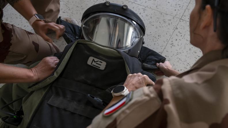 Les équipes médicales ont pu mettre en pratique ces gestes, tester leur matériel et porter eux-mêmes la combinaison EOD afin de mieux appréhender les contraintes et les différents points de pression pouvant être exercés sur le corps d’une victime. Ainsi, cet entraînement essentiel a permis au Rôle 1 d’identifier les difficultés pouvant être rencontrées dans ce genre d’intervention.