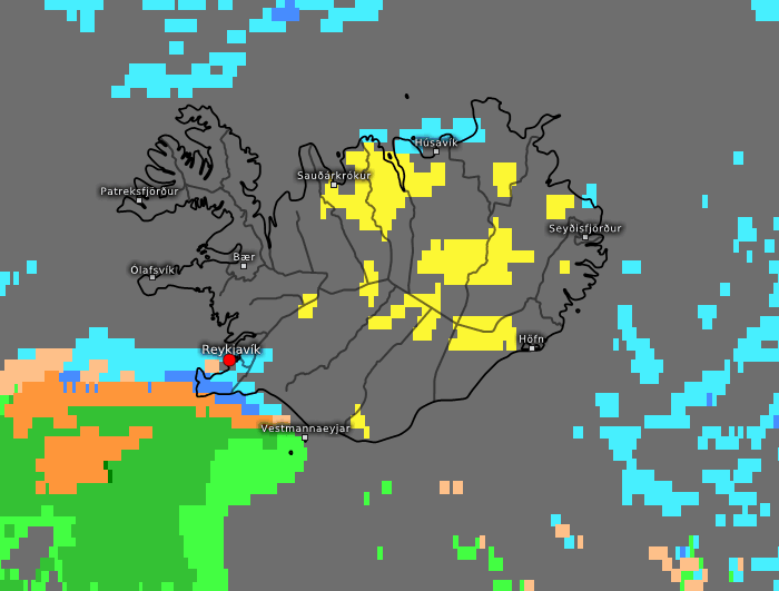 Un petit minimum dépressionnaire s’est formé au sud-ouest de l’Islande en début de semaine. Ce mardi 28 octobre 2025, un front s’est enroulé autour de cette dépression très peu mobile et a stationné tout au long de la journée sur le sud-ouest de l’Islande avec des intensités de précipitations notables. C’est la région de la capitale Reykjavík qui fut la plus touchée, comme l’illustre l’animation ci-dessous, avec près d’une vingtaine d’heures consécutives de chute de neige. Par isothermie, la température a chuté entre 0 et -1°C, permettant à une neige lourde de s’accumuler avec un total de 27 cm sur la capitale !