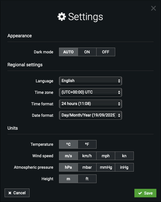 Activating dark mode is simple: just click the cog icon in the top-right corner of the screen or head to your Preferences page when logged in. For ultimate convenience, select the Auto option and Weathercloud will automatically match your system settings, switching seamlessly between light and dark.