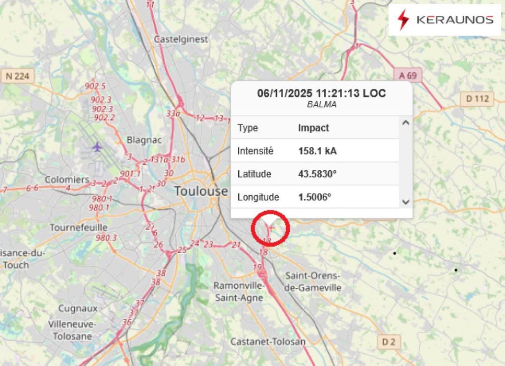 on 7 novembre 2025 at 4:47 PM Ce jeudi 6 novembre sur la Ville Rose⚡️⚡️Un impact de foudre explosif a frappé le sud-est de Toulouse (Balma) à 11h21. Avec une intensité de 158 kA, il entre dans les 0,3% d’éclairs les + puissants de 2025 en France. ➡️en savoir + sur les services foudre Keraunos : https://www.keraunos.org/services/details-produits-services/agriculture/alerte-foudre-orage-france-en-direct #foudre #eclair #orage #toulouse
